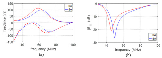 The antenna’s frequency agility with a tuning current between 0 A and 5 A on (a) input impedance and (b) reflection coefficient.