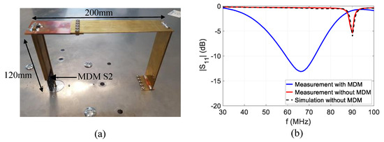 The fabricated IFA antenna loaded with S2 MDM is shown in Figure 10a. A preliminary measurement is carried out on the antenna without MDM in order to validate the design. The antenna’s frequency response obtained by simulation without MDM meets measurement results, as shown in Figure 10b. This preliminary result is important, as it leads to avoid any interrogation about antenna design during agility characterization with the material. A comparison between the antenna’s operation frequency measurement with and without MDM is also plotted on Figure 10b. This figure shows that the use of MDM to load the IFA antenna leads to a miniaturization factor of 27%, as observed on the operation frequency shift between 90 MHz (without MDM) and 66 MHz (with MDM-0A).