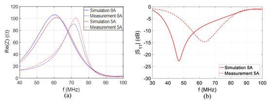 As shown in Figure 10a, the measured frequency agility is about 2% around 75 MHz. This frequency agility is lower than the values of 6% expected from the EM simulations (Figure 9). This difference is related to the experimental conditions using a bias tee supporting currents limited to 5 A. As a result, the maximum current biasing MDM on each of three short-circuit is 1.67 A for the experimentations. In the simulation (Figure 9), the maximum potential of agility has been considered with 5 A on each antenna’s short-circuit (the MDM has been designed to provide maximum tunability with this DC current value). The comparison of antenna’s real part input impedance between measurement and simulation considering the 5 A biasing current split is plotted in Figure 10b. The frequency agility obtained in simulations considering the limited current measurement conditions is 2.5%, which is comparable to measurement results. These results confirm the frequency agility of the MDM S2 and its decent model of permeability dynamics used in simulation tools and extracted from material characterization [18]. Nevertheless, a frequency shift of 19% is observed, considering impedance measurement and simulation results at a biasing current of 0 A (Figure 11a). The same phenomenon is observed in Figure 11b, which shows a frequency shift of 26% on the antenna’s operation frequencies, with a biasing current of 5 A. This difference is probably due to MDM model inaccuracy in terms of permittivity and permeability properties, which can be readjusted in the simulator, in order to fit with measurement results.