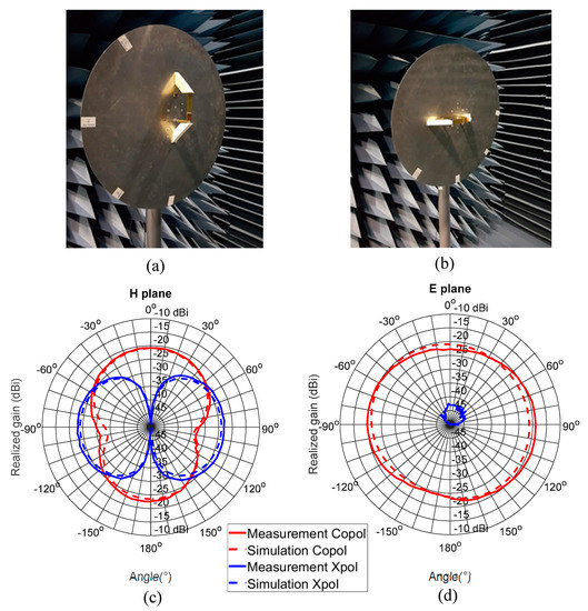 Two cut planes considered for radiation pattern measurement (a) H plane illustration, (b) E plane illustration, (c) antenna gain patterns in the H plane and (d) gain patterns in the E plane.