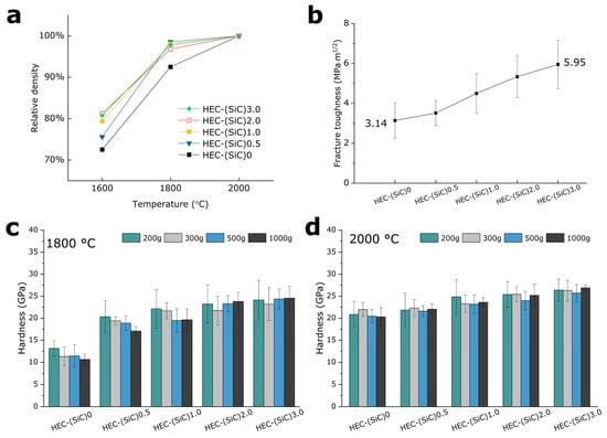 (a) The relative densities of high-entropy ceramic (HEC)-(SiC)x (x = 0, 0.5, 1.0, 2.0, 3.0) composites at different sintering temperatures, (b) fracture toughness of the composite from 2000 °C, (c,d) are the Vickers hardness of HEC-(SiC)x composite at 1800 °C and 2000 °C, respectively, as function of different indentation load.