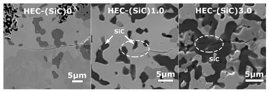 The fracture toughness of HEC-(SiC)x composites sintered at 2000 °C were calculated by analyzing the indentation cracks on the sample surface. Shown in Figure 1b, the fracture toughness of the HECs composites increased 89%, from 3.14 MPa·m1/2 for HEC-(SiC)0 to 5.95 MPa·m1/2 for HEC-(SiC)3.0, which is comparable to the 20 vol. % SiC-reinforced high-entropy carbide (5.24 MPa·m1/2) as reported by Lu et al. []. The correlated crack morphologies of HEC-(SiC)0, 1.0, and 3.0 are shown in Figure 2. It can be seen that the indentation cracks in the HEC-(SiC)0 composite are propagating through the bright phase (transgranular) and along the boundary of the gray phase (intergranular), producing a continuing straight crack path on the sample surface. With the SiC addition to the composite, SiC grains interact with the crack propagation and enhance fracture toughness by toughening mechanisms such as crack bridging shown in the HEC-(SiC)1.0 composite and crack deflection shown in the HEC-(SiC)3.0 composite (marked with white circles) in Figure 2.