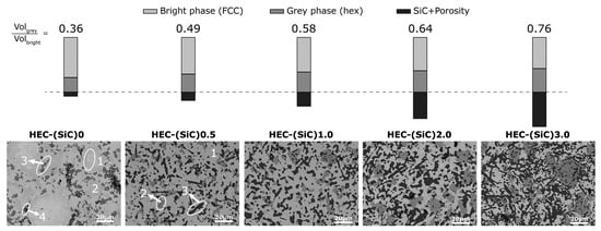 Figure 3 shows the backscattered electron (BSE) micrographs of the sintered HECs with different SiC content from x = 0 to 3.0. Each contrast in the microstructure refers to a region with a constant density due to the high sensitivity of the BSE detector to the atomic number, which is correlated directly to the material density []. The microstructures of HECs containing SiC (x = 0.5, 1.0, 2.0, and 3.0) consist of three distinct phases—bright, gray, and dark (marked as 1, 2, and 3 in the microstructure of HEC-(SiC)0.5 in Figure 3). Whereas the microstructure of HEC without addition of SiC (HEC-(SiC)0) show four different contrasts (marked as 1 to 4 in HEC-(SiC)0). According to energy-dispersive X-ray spectroscopy (EDS) analysis, the darkest region in all of the four HEC-(SiC)x compositions (x = 0.5, 1.0, 2.0, and 3.0) refers to SiC and a trace amount of porosity present at the interface between the SiC phase and the adjacent phase, which was created during the grinding and polishing process. The SiC phase appears in different irregular shapes with lower aspect ratio than the original fiber-shaped whiskers, which could be a result of the morphology transformation of SiCw under the effect of elevated temperature. A similar morphology change of SiCw from a fiber-to particle-shaped structure at high temperatures has been observed by Cheng et al. [] and Zhou et al. []. The volume fraction of the phases with a certain contrast are analyzed using the image analysis. In the bar chart in Figure 3, each individual column refers to the 100 vol. % of the corresponding specimen with the contribution of each phase to it, demonstrated by the length of the sub-columns marked with different grayscales. For the HEC-(SiC)0 composite that has four different contrasts, the two brightest phases are summarized in the bright sub-column. From x = 0 to 3.0 in the HEC-(SiC)x system, regardless of the increase in the amount of SiC, the ratio of the volume fraction between the gray and the bright phase rises from 0.36 to 0.76. As the sintering parameters for all these five samples are the same, the experimental results suggest that the addition of SiC facilitated the formation of the gray phase over the formation of the bright phase.