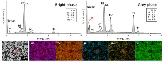 According to the EDS results, both the gray and bright regions observed in all five composites contain four constituent metal elements—Hf, Mo, Ta, and Ti—however, with different atomic compositions. For SiC-containing composites where only two visible contrasts, except for SiC, were observed, carbon was detected in both of the phases while boron was only observed in the gray phase. EDS spectra collected from these gray and bright phases are similar among the HEC-(SiC)x composite, as shown in Figure 4, which were obtained from HEC-(SiC)1.0. It can be seen from the EDS spectra that the boron X-ray emission peak is absent in the bright phase yet displayed beside the carbon peak in the gray phase. The quantitative analysis shows that the gray phase has higher abundance of Mo and Ti than the bright phase, displaying significantly higher intensities of the correlated EDS peaks of Mo and Ti in the spectrum. The higher content of Mo and Ti in the gray phase can be confirmed in the EDS elemental maps in Figure 4. These results are in agreement with the darker contrast of the gray phase than the bright in the BSE microstructure, due to smaller atomic numbers of Mo and Ti compared to Hf and Ta. For the composition without SiC addition, HEC-(SiC)0, the spectra collected from the two brightest regions are similar with similar quantitative atomic compositions. The HECs synthesized at high temperatures could be meta-stable at room temperature, the microstructure and composition heterogeneity was possibly caused by spinodal decomposition during the cooling []. A similar decomposition phenomenon due to a different cooling rate throughout the specimen was observed in the high-entropy carbides by Castle et al. [].