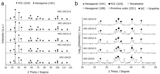 (a) X-ray diffractogram of HEC-(SiC)x composites sintered at 2000 °C (the corresponded space groups are marked in the bracket), (b) the intensities are plotted in logarithmic scale. The reduction of the number of the phases in the composites can be observed with increased SiC content.