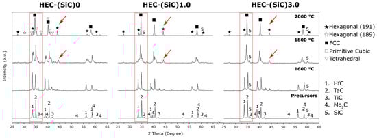 Figure 6 shows the comparison of the XRD patterns of the as-mixed precursors and the HEC-(SiC)x composites sintered at different temperatures. It can be seen that phase transformation has not taken place at 1600 °C. The FCC peaks start to converge at 1800 °C, indicating the initial formation of the FCC-structured high-entropy ceramic phase. The strongest diffraction peak of the hexagonal (191) structure at 2θ = 44° (marked with the red arrow) started to be visible at 1800 °C, suggesting the initial formation of hexagonal phase at 1800 °C. The composition of HEC-(SiC)x composites at 2000 °C is similar to what was achieved in our previous study on the B4(HfMo2TaTi)C/SiC composite, however at lower temperature (1800 °C) [], attributed to a higher heating rate applied in this study (200 °C/min compare to 100 °C/min). Similar dependence of the sintering temperature on the heating rate in SPS has been reported [,].