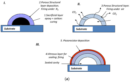 This process of manufacturing a capacitive or piezoresistive pressure sensor by screen printing is potentially exploitable for the realization of closed-cavity structures and can be described by the following steps (Figure 2a): The deposition and the thermal treatment of a carbon filled polymer ink, which acts as a sacrificial layer; the deposition of a glass-ceramic type dielectric that acts as a porous structural layer and that is partially covering the substrate and completely overlaying the sacrificial layer; firing under nitrogen in order to not oxidize the sacrificial layer while consolidating the structural layer; firing the component under air to remove the sacrificial carbon layer through the porosity of the structural layer; the deposition of a vitreous structural layer on the porous dielectric layer in order to seal and mechanically reinforce the latter; the deposition of additional structural layers to functionalize the sensor; and air firing to consolidate the sensor.