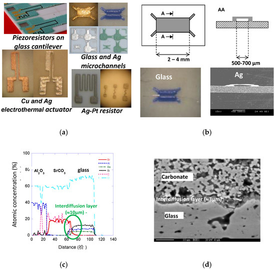 SEM analysis of a cross-section of a silver microchannel showed the efficiency of the process [22]. Nevertheless, chemical reactivity between the glass and carbonate was noticed in the case of a glass microchannel, as illustrated by the Castaing microprobe analysis of an unreleased microchannel (Figure 4c). This chemical reactivity was reduced by adding 5% CO2 to the firing atmosphere, leading to a decrease in the thickness of the interface (about 3 µm) (Figure 4d).