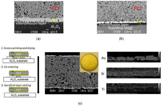 In the mineral approach, the SrCO3 is mixed with epoxy to confer consistency to the screen-printable ink. The microstructure of a free-standing PZT layer in a sandwich architecture between two Au electrodes supporting the fragile piezoceramic layer can be compared to multilayers sintered on alumina and stainless steel substrates (SS), respectively (Figure 5a,b). Au electrode and PZT layers are successively printed, dried at 120 °C between each step, and the stacked layers are finally co-sintered. All the layers are isostatically pressed at 40 MPa before sintering. Li2CO3Bi2O3CuO (LBCu) was successfully used as a sintering aid to reduce the sintering temperature to 900 °C while keeping good piezoelectric properties, as reported in [46]. The addition of only 3% in weight of LBCu was shown to be efficient for PZT sintering, both the melting of the binary system Bi2O3-Li2CO3 and the presence of CuO play a significant role in lowering the sintering temperature [47,48]. For bounded layers, a diffusion/adhesion layer is formed between the substrate and the Au layer, as already observed in [40,42]. In the case of the free-standing PZT layer, only a slight diffusion of Sr into the Au layer is observed, showing the efficiency of the Au electrode as a barrier to limit PZT/SrCO3 cross-diffusion (Figure 5c). The densification of bounded and free standing layers evaluated by ImageJ [36] is quite similar, with a porosity of 20–25%. This residual porosity is the consequence of the densification being affected by the mechanical clamping of the substrates on one side, and by the constrained shrinkage on the remaining SrCO3 during the sintering on the other.