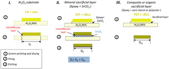 In this section, since some studies have already reported PZT screen-printing on silicon [37,38] followed by its release, only thick films printed on ceramic substrates and partially or completely dissociated from the substrate are considered. Bounded screen-printed PZT layers can be found in the literature [39,40,41,42], and more recently lead-free piezoelectric layers [43]; however, to the best of our knowledge, only screen-printed PZT thick films have been released from the substrate. When processing screen-printed PZT thick films using a conventional process, the PZT layers contain a residual porosity. When the sintering temperature is increased above 950 °C, PZT’s stoechiometry can be modified if the atmosphere is not controlled to prevent Pb losses. Interdiffusion phenomena between the layers during co-sintering can also affect the properties. As a result, the use of a sintering aid, associated to an isostatic pressing step was the selected option to improve densification while reducing the sintering temperature [44,45]. Here, and according to the classification discussed above, we will classify the used sacrificial layers in two categories according to the removal step: