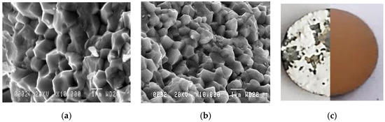 PZT ceramics sintered without and with protective carbonate layers have an optimal relative density close to 98%, estimated by geometrical measurements. The microstructural investigation made on fractured ceramics revealed a homogeneous microstructure for all the ceramics with a comparable average grain size in the range 2–4 μm (Figure 8a,b). It can be concluded that the presence of a protective layer during SPS does not significantly affect the densification.