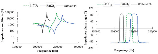 Electromechanical measurements performed directly after SPS with and without an annealing step are shown in Figure 9. Results with annealing were compared to those obtained with SrCO3 and BaCO3 as a protective layer. A slightly lower but comparable effective electromechanical coefficient keff was observed for samples with a BaCO3 protective layer, with a value of ≈38%, whereas for SrCO3, keff ≈ 40%.