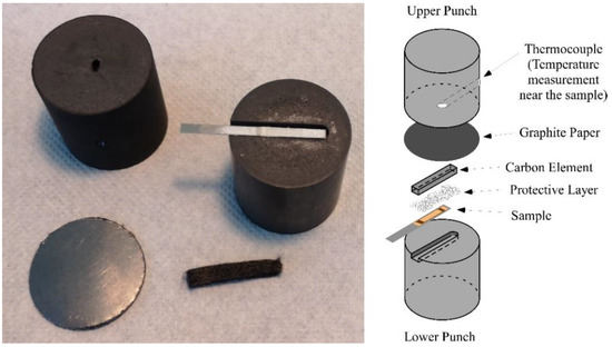 Many examples of modified standard setups have already been reported for specific experiments [64,65,66,67,68]. Starting from the standard graphite die used in SPS experiments, the design of the graphite tools to be used was at first simplified to a “no die” setup with two Ø = 30 mm cylinders. The first direct advantage of this setup is the energy saving during heating, given the much lower graphite volume used compared with a classical complete die with the same inner diameter. The improved placement of the thermocouple for the temperature measurement (almost at the sample) allows for a much finer control of the sintering conditions. Finally, the configuration shown in Figure 10 allowed for the best results. A carbon element has been used in addition to the protective layer, in order to guarantee a minimum contact pressure during sintering to avoid delamination.