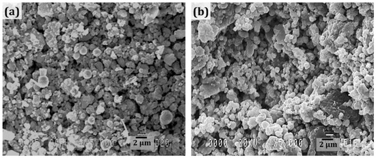 The microstructure of a fracture of the PZT within the multilayer obtained in the conditions described above was compared with that of the screen-printed PZT thick film conventionally sintered on the same stainless steel substrate (Figure 11). Grain sizes were comparable (≈1–4 µm), and in both cases the grain size distribution remained quite large. The level of porosity lay in the same range (15–20%), although in the case of SPS, the sintering temperature was slightly lower (850 °C versus 900 °C), and the sintering dwell time was significantly shorter (5′ instead of 2 h). In addition, it is noteworthy that SPS was performed without a sintering aid and without a preliminary pressure step. Compared to PZT ceramics sintered by SPS (Section 3.2), the increase in porosity within the stack can be mainly explained by the low pressure applied on the multilayer and the slightly lower sintering temperature.