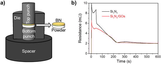 (a) Sketch illustrating the SPS set-up with the bottom punch fully enclosed into the die and leaned on the spacer, and a BN slab placed between the top punch and the ceramic powder compact. (b) Electrical resistance versus the SPS time recorded during the heating ramp for the Si3N4/GOs powder composition and compared with data previously reported for Si3N4 powders using the same SPS conditions [6].