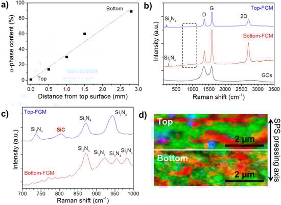 (a) α-phase Si3N4 content along the cross-section of the sintered Si3N4/GOs specimen. (b) Average Raman spectra for pristine GOs and at the bottom and top areas of the FGM and (c) zoom of the dashed region. (d) False colored Raman images at the bottom and top surfaces of the FGM by merging the intensity maps of the G-band of rGOs (red), TO of SiC (blue), and Si3N4 peaks in the interval of 175–250 cm−1 (green).