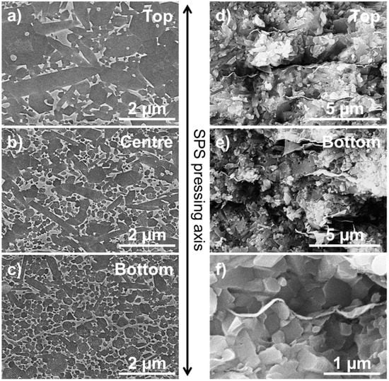 The microstructural analysis performed by FESEM evidenced a progressive growth of the Si3N4 grain size (Figure 3a–c) from the bottom surface of the specimen (d50 = 230 nm) towards the top surface (d50 = 570 nm), which corresponded to an augment of ~150%. In addition, grains also evolved to a more elongated shape, increasing AR50 from 1.6 (bottom) to 1.9 (top), being in good agreement with the larger β-phase content at the top surface. This graded microstructure would be directly linked to temperature differences into the powder compact during the SPS process. In this way, the temperature mismatch between the bottom and top surfaces of a monolithic Si3N4 FGM, using the same SPS setting conditions than in the present work, was previously estimated to be around 150 °C [6]. As the phase transformation gradients in that FGM and in the current Si3N4/rGOs FGM are quite similar, a similar temperature difference could be assumed for the rGOs-based FGM. However, the increment in the grain size in the composite FGM was smaller (150%) than in the monolithic Si3N4 FGM (240%), which could be explained by the presence of rGOs that would limit the matrix grain growth in the composite [13]. The fracture surface views of the cross-section of the FGM at the top (Figure 3d) and at the bottom (Figure 3e) showed the clear alignment of the rGOs perpendicularly oriented with respect to the SPS pressing axis. A homogeneous dispersion of the rGOs into the matrix was also observed, with the rGO sheets following the ceramic boundaries with a wavy shape (Figure 3f).