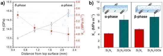 (a) Hardness (H) and fracture toughness (KIC) evolution along the cross-section of the Si3N4/rGOs FGM. KIC was obtained by the indentation fracture (IF) method. (b) KIC values obtained by SCF method for monolithic Si3N4 FGM and Si3N4/rGOs FGM tested on the α- and β-phase surfaces.