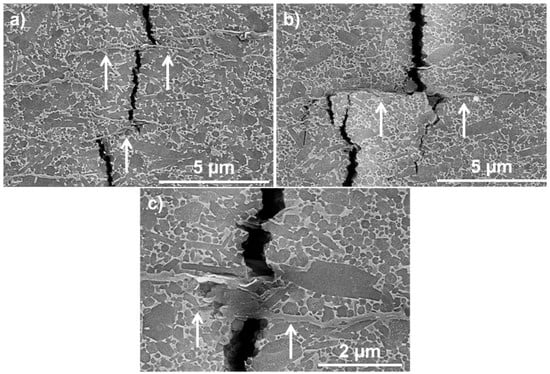 FESEM images showing different crack shielding mechanisms promoted by rGOs that would enhance the fracture toughness: (a) crack deflection, (b) crack branching and (c) crack bridging. Arrows point the rGOs location. The crack was generated by Vickers indentation performed on the polished cross-section of the FGM.
