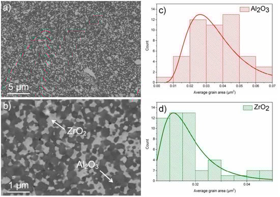 The results of the microstructure analyses of the investigated systems are illustrated in Figure 2, Figure 3 and Figure 4 and Table 1. In Figure 2, we show characteristic microstructures of the Al2O3–ZrO2 system at different magnifications and the results of the statistical analyses of the individual grain size/area. It is evident that the system is very homogenous without the presence of larger defects in the form of pores, voids, clusters of grains, or large grains. The area of Al2O3 grains changes from 0.01 to 0.07 μm2 with an average grain area of 0.035 μm2, considering that circular grains are approximately 0.22 μm in diameter. The ZrO2 grains are smaller, with a diameter of approximately 0.15 μm.