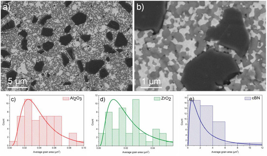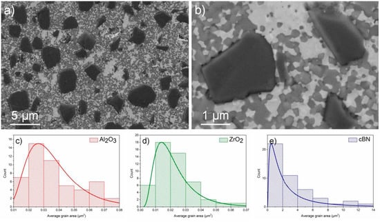 Microstructure (a,b) and grain size distribution (c–e) of Al2O3 + ZrO2 + 20% cBN system.