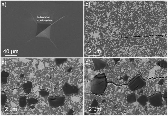 The presence of cBN grains in the composites initiated different toughening mechanisms (Figure 5), mainly crack deflection, very similar for both investigated systems, only the frequency of their occurrence is slightly different. However, in both investigated composites, the crack deflection is not so effective, which probably is connected with the mentioned weak cBN/matrix interphase. This weak interphase results in an easily created crack deflection, which energetically contributes less to the toughness improvement.