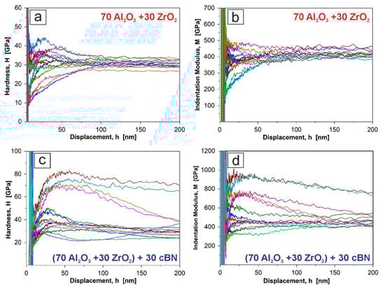 Characteristic hardness–displacement and indentation modulus–displacement relationships arising during the nanoindentation of Al2O3 + ZrO2 and Al2O3 + ZrO2 + 30% cBN systems are illustrated in Figure 6. The curves are selected as curves connected with the indentation of matrix or cBN grains based on SEM observation of the indented surface without information on which phases are in close vicinity below the indent.