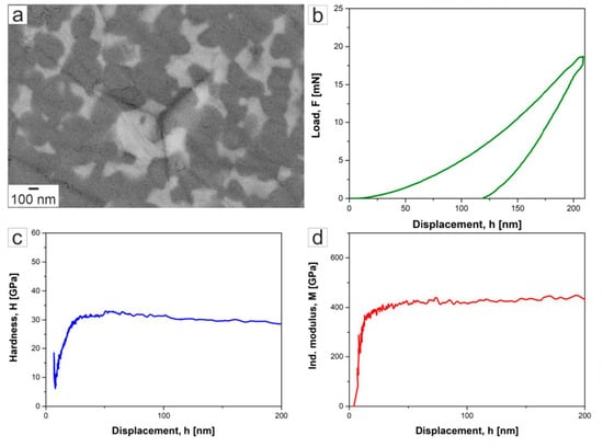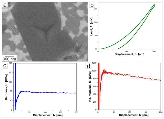 Characteristic nanoindentation with the corresponding load–desplacement, hardness–displacement, and indentation modulus–displacement curves for the Al2O3 + ZrO2 + 30% cBN system is illustrated in Figure 8. The indent was selected very carefully to show representant nanohardness characteristics for the cBN grain. No visible pop-in effect was found during the indentation and the curves show characteristic load–size effect.