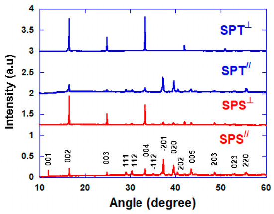 X-ray diffraction of the face perpendicular and parallel to the applied pressure direction during processing is shown on Figure 3. The patterns show the single-phase nature of the powders with no secondary or impurity phases. All the peaks were indexed as on XRD patterns of conventional sintering samples reported elsewhere [25]. This indexation including satellite reflections originated from the misfit-layered structure was made according to some [26,27] reported works. The faces perpendicular to the applied pressure (SPS⊥ and SPT⊥ samples) reveal strong (00ℓ) reflections, in contrast to the faces parallel to the applied pressure (SPS// and SPT// samples) where more peaks are (hk0) or non-sample showing all (hkℓ) diffraction peaks [25]. This shows that the experimental process tends to align the crystallographic c-axis of platelets following the preferential axial direction. These features can be correlated with the following microstructures.