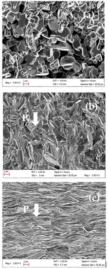 The microstructure of the sample prepared by SPT is shown in Figure 7a. The fractured cross-section is evidenced. We can observe a high degree of orientation of large platelets compactly stacked (98% relative density) along the stress direction. This stands in contrast to non-pressed samples [37] in which much smaller platelets appear to be randomly distributed and loosely assembled, resulting in a weak relative density (60%). The microstructural aspects for the textured sample clearly show an increase in elongated platelet size (6 μm) and a decrease in the voids between the grain boundaries. Figure 7b shows the SEM of the face broken perpendicular to the applied annealing pressure. In contrast to the parallel direction, the large grains with the surface parallel to the applied pressure are evidenced.