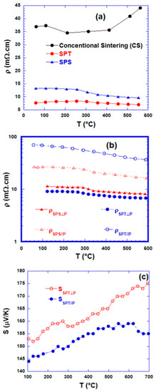 The temperature (T) dependence of the resistivity (ρ) for the reference Ca3Co4O9 sample (σ = 0 MPa), and the samples processed by SPS and SPT respectively is shown in Figure 5a. What can be deduced from it? The ρ(T) curves show similar behavior, with the magnetic transition around 250 °C. This is in agreement with some reports [12,25] on thermoelectric oxides. These curves show that at 100 °C, the resistivity of the non-pressed sample is 37 mΩ.cm as compared to 17 and 7 mΩ.cm for the SPS and SPT samples respectively. The decrease in resistivity values can be considered as being due to the densification of the material under pressure and good alignment between grains. For the thick SPS and hot stacked SPT samples, the electrical resistivities (Figure 5b) have been measured in parallel and perpendicular directions to the applied pressure during sample processing. As expected, the electrical resistivity of the samples processed by Spark Plasma Sintering and Texturing exhibit a high anisotropy than the SPS one. At 150 °C, we can deduce a ratio of ρSPT// /ρSPT⊥ = 7 for SPT compare to ρSPS// /ρ SPS⊥ ~ 2 for SPS sample. This is well correlated to the microstructure shown in Figure 4 where the SPT exhibits strong alignment of platelets where the current can flow easily and lead to the low in-plane resistivity (/ρSPT⊥).