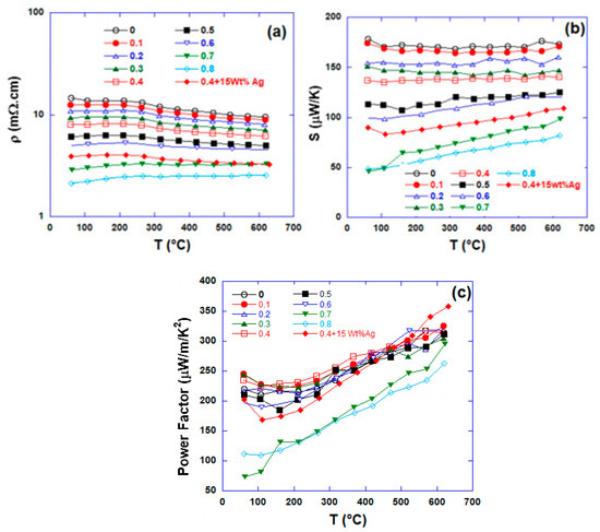 Figure 6b shows the temperature and Ag content dependencies of the thermoelectric powers or Seebeck coefficients, S of the samples. As expected, S decreases with increasing Ag content. Basically, the thermoelectric power depends on the chemical composition of the material. The fraction of Co4+ holes on the Co sites in the CoO2 layers change progressively with Ag content and systematically induce the modification in the thermoelectric power according to the Heikes formula [36]. The optimized composite is found to be Ca2.6Ag0.4Co4O9/15wt% Ag. We can note the remarkable reduction of ρ, and an improvement of power factor (Figure 6c) value up to 360 μW.m−1.K−2 compared to 314 μW.m−1.K−2 and 260 μW.m−1.K−2 respectively for un-doped sample and sample with Ag content x = 0.1.
