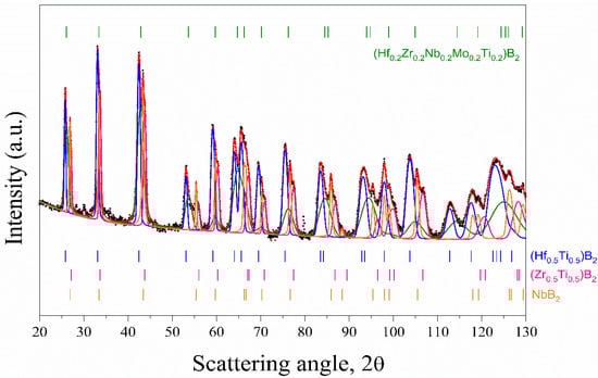 The compositions of HEB_a and HEB_b products obtained by SHS are reported and examined in detail elsewhere [8,13]. On the other hand, the synthesis of (Hf0.2Zr0.2Nb0.2Mo0.2Ti0.2)B2 by SHS was carried out for the first time in this work. The XRD experimental pattern (black rhombohedral) and the best fit (red line) relative to the corresponding SHS product are shown, on a log scale, in Figure 1. A multiphase product was obtained after the synthesis process, which agreed with the results obtained with the other HEB systems previously investigated, i.e., of HEB_a [5] and HEB_b [8]. Rietveld analysis was performed using (Hf0.2Zr0.2Nb0.2Mo0.2Ti0.2)B2, (Hf0.5Ti0.5)B2, (Zr0.5Ti0.5)B2 and NbB2 as a starting model according to Barbarossa et al. [8] for a similar system. The excellent degree of matching of the model with the experimental data was established by the low R-factor (Rwp = 6.43%) achieved for this analysis. Table 2 summarizes structural and microstructural parameters obtained from the Rietveld analysis applied to the pattern reported in Figure 1.