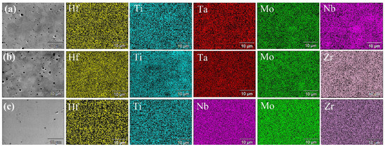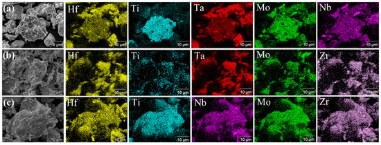 The obtained SHS products were also examined by SEM and EDS before being mechanically treated. The corresponding results are shown in Figure 2. From the elemental maps, it was apparent that, in agreement with the XRD analysis, the five metal elements were not homogeneously distributed across each grain. Nevertheless, a reasonably good level of mixing was achieved for all three systems after SHS, which was extremely important, as discussed later, to promote the formation of a single-phase product during the sintering step.