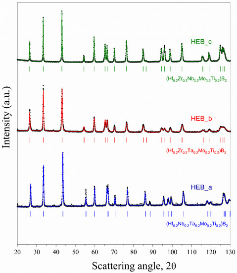 The preparation of (Hf0.2Nb0.2Ta0.2Mo0.2Ti0.2)B2, (Hf0.2Zr0.2Ta0.2Mo0.2Ti0.2)B2, and (Hf0.2Zr0.2Nb0.2Mo0.2Ti0.2)B2 products, hereto after indicated as HEB_a, HEB_b, and HEB_c, respectively, was carried out starting from Hf (Alfa Aesar, cod. 00337, particle size < 44 µm, 99.6% purity), Mo (Aldrich, cod 266892, particle size < 149 µm, 99% purity), Ta (Alfa Aesar, cod 00337, particle size < 44 µm, 99.9% purity), Nb (Alfa Aesar, cod 010275, particle size < 44 µm, 99.8% purity), Ti (Aldrich, cod 268496, particle size < 149 µm, 99.7 purity), Zr (Alfa Aesar, cod 00418, particle size < 44 µm, > 98.5% purity), and B (Aldrich, cod 15580, amorphous, 99% purity) reactants. Metals were combined in stoichiometric proportions, whereas an excess of boron (B to metal ratio of 2.2:1) was used to compensate the partial loss of this element during SHS, as explained elsewhere [5,8]. Powders were first mixed for 20 min in a SPEX 8000 (SPEX CertiPrep, USA) mill using plastic vials and alumina balls, then cold-pressed to provide cylindrical pellets, which were finally reacted in argon environment by SHS. Details on the experimental apparatus and the procedure are reported in a previous work [26]. The obtained porous product was ball milled for 60 min (ball-to-powder or charge ratio, CR, equal to two) using the milling device mentioned above and stainless-steel tools. No detectable contamination from milling media was found under such conditions. To improve product purity and densification, about 1 wt.% graphite (Aldrich, cod 282863, particle size 1–2 µm) was added to the SHS product before being mechanically treated. Such a specific amount of this additive was recently shown to be the optimal one to reduce oxides content and maximize powder consolidation while avoiding the presence of residual graphite in sintered products [8].