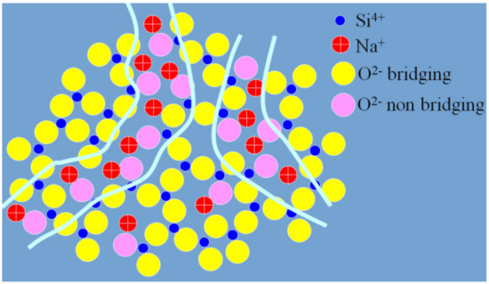 The SRO in oxide glasses and melts is represented by polyhedral structural units such as tetrahedral and octahedral structural units with typical sizes about 1.6–3 Å. The SRO structural groups in commercial glasses are usually tetrahedral Si, B, Al, Fe, and P surrounded by four oxygen atoms (tetrahedral coordination) or B surrounded by three oxygen atoms (trigonal coordination). The tetrahedra and trigonal species in glass link to each other via bridging oxygen (BO) bonds. The remaining non-bridging oxygen atoms (NBOs) effectively carry a negative charge and ionically bond positively charged cations such as Na+ or Ca2+. The regions are comprised of large concentrations of network modifiers so that alkalis form ionic percolating channels at higher concentrations—in silicate glasses typically at about 67 mol% of silica, whereas at higher content of silica, these regions are isolated from each other by the silica skeleton (network regions). NBO are located at the interface between the ionic channels and the covalent network and BO are located within the network regions [15,20]. The SiO4 tetrahedra define the network regions, while NBO atoms define depolymerized regions that can form percolation channels. The percolation ionic channels are defined by the NBO atoms at the edges of the highly ordered network regions, which ionically bond to the alkali, alkaline earths, or other modifier species in a glass (Figure 1). The MRN model is indeed associated with the structural heterogeneity in glass. For example, Moesgaard et al. [21] provided the direct, strong NMR evidence for the structure heterogeneity at medium-range scale in silicate glasses, i.e., the existence of less polymerized Ca-Si-O domains (corresponding to the percolation floppy domain in MRN) and fully polymerized AlO4-SiO4 domains (rigid domains). Moreover, the fragile region and strong region coexist in glass, as reported in [22].