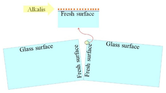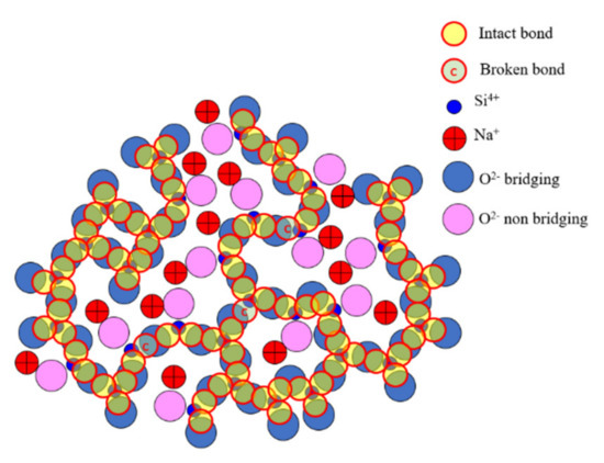 The cationic percolation channels can be visualized as they act as ion-exchange paths for elements that are less well bonded in glasses. Indeed, cations being bound to the NBO result in the fact that the ion exchange occurs along percolation channels that exist in the glass structure. The percolation channels have been experimentally observed at the glass–gel interface when the leached layer was removed [15]. Ion exchange occurs along percolation channels that exist in glass, and the dissolution appears to follow percolation channels. It has been revealed that on fracturing, the alkali-silicate glasses form fresh surfaces that are enriched in alkalis and so supporting the MRN model of glasses (Figure 2).
