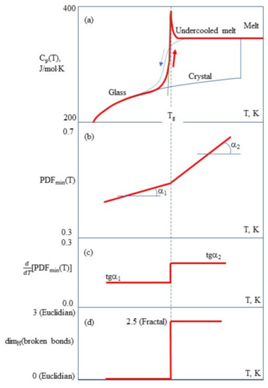 The main characteristics of glass–liquid transition that demonstrate the thermodynamic origin and structural changes behind transformation. (a) The temperature (T) dependences of the isobaric heat capacity (Cp) by differential scanning calorimetry (DSC) during the heating of a glass at a typical rate of 10 K/min. The glass−liquid transition during upscan is always featured by a Cp jump, whereas the vitrification (liquid−glass transition) on cooling during downscan is reflected by a gradual Cp drop [30]. (b) The temperature dependence of the first sharp diffraction minimum (FSDM) value of pair-distribution function (PDFmin) on the scattering of incident neutron or X-rays indicating that at the Tg there is a substantial change of slope due to structural changes at the glass transition [31]. (c) The temperature dependence of the first temperature differential of FSDM value d(PDFmin)/dT indicating that at the Tg, there is a stepwise change of slope due to structural changes at the glass transition [31]. (d) The temperature dependence of the Hausdorff–Besicovitch dimension D = dimH(broken bonds) of the set of broken chemical bonds at the glass transition changes suddenly as change the material properties. The set of broken bonds termed configurons has D = 0 below the Tg, and D = 2.55 ± 0.05 above it [32].