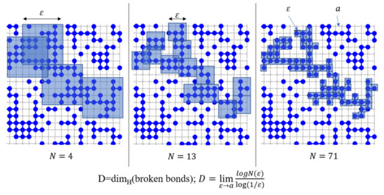where N(ε) is the number of boxes of side length ε required to cover the set of broken bonds (configurons). When N(ε) grows proportionally to 1/εD as ε tends to zero, then we conclude that the set has the Hausdorff–Besicovitch dimension D. In the counting procedure, we start with macroscopic large lengths, diminishing them step by step to microscopic scales (Figure 4).