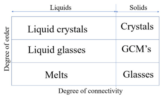 Recently, liquid glasses were discovered experimentally in suspensions of ellipsoidal colloids that similarly to liquid crystals demonstrate glass-like properties before being melted [48]. It is well known from earlier investigations that emulsions exhibit fractal structures at small sizes [49]; however, structural imaging at high concentrations has been limited to systems composed of spherical colloids. The authors of [48] revealed that suspensions of ellipsoidal colloids form an unexpected state of matter, a liquid glass in which rotations are frozen while translations remain fluid. The nematic precursors were characteristic structural elements of this state, and the mutual obstruction of these ramified clusters prevented liquid crystalline order. Thus, we can generalize the state of matter schematic proposed in [50] as a function of connectivity and ordering (Figure 5).