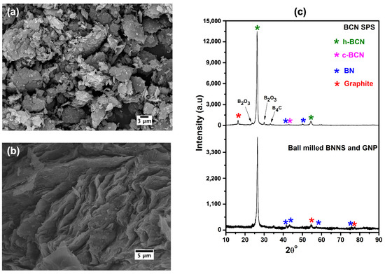 The BCN-material was prepared from a mixture of BN nanosheets (the same parameters as above) and GNPs (particle size 3 to 15 m, thickness of 6 to 8 nm). The mixture was homogenized by ball milling for 30 min (the resulting powder is shown in Figure 2a). Then, the material was compacted using SPS (1750 C for 20 min at the heating rate of 100 C/min with pressure of 50 MPa) which resulted in a reaction synthesis of BNNS and GNPs leading to formation of BCN. X-ray diffraction was used to confirm that the reaction was accomplished. As seen from the results (Figure 2c), the final compacted material consisted mainly of the hexagonal BCN (h-BCN) phase, with some small amounts of cubic BCN (c-BCN), BC, BO and graphite. Local variations of the preferred orientation of the particles were observed, as seen in Figure 2b. However, the nano-indentation tests gave the reduced elastic modulus along the SPS compression axis as GPa and GPa in the perpendicular direction, i.e., the ratio was exactly the same as for the BNNS-material. Measured true density of the mixed powder was 2.38 g/cm, and the resulting density of the compact was 2.25 g/cm. Assuming the theoretical density of pure h-BCN equal to 2.45 g/cm [41], this resulting density of the compact indicates the porosity of approximately 8 %.