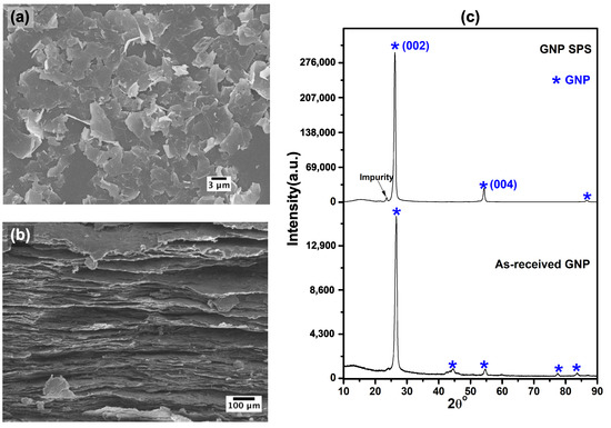 Scanning electron microscopy images of (a) as-received powder and (b) fracture surface of bulk GNP documenting the preferred orientation of the platelets. (c) XRD patterns of the powder and bulk GNP. See [21,23] for more details.