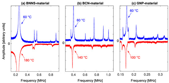 Secondly, the RUS spectra were recorded at elevated temperatures in order to analyze the temperature-dependence of the internal friction. In these temperature-resolved measurements, the vibrational response of the sample was recorded only in a single point (i.e., without scanning). This was completely sufficient for the internal friction analysis, where the shapes of the peaks were analyzed. The first measurement was done at 60 C, and the temperature was subsequently increased with a 20 C step (±0.1 C temperature stabilization) and series of RUS spectra were recorded. A rapid increase of the widths of the resonant peaks (indicating increase of the internal friction, as explained below) with increasing temperature was observed. The experiment was terminated when the internal friction was so strong that it was impossible to identify more than five resonant modes. For the BNNS-material, this threshold was reached above C, for the BCN-material above C and for the GNP-material above C. The comparison of the single-point RUS spectra at 60 C and at for all materials is given in Figure 4. It is seen that with the increasing temperature the peaks are shifting to lower frequencies, which means elastic softening of the material, and also the peaks are getting broader, neighboring peaks are merging, and the signal-to-noise ratio is decreasing.