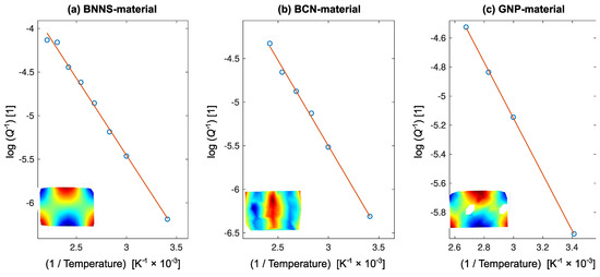 The versus plots for the determination of the activation energy shown for one selected resonant mode for each material. The dots are the experimental data, the lines are the results of the linear regression. In each plot area, the experimentally recorded shape of the given mode is shown.