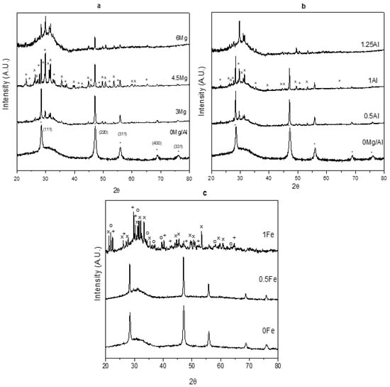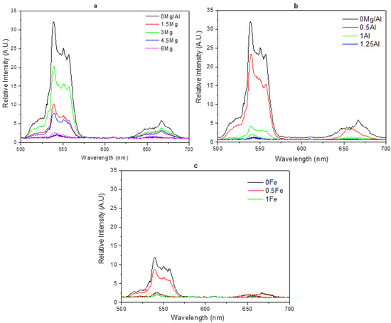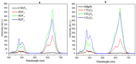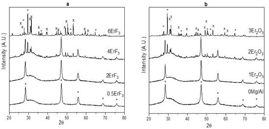 - Chen, D.; Wang, Y.; Yu, Y.; Ma, E.; Bao, F.; Hu, Z.; Cheng, Y. Influences of Er3+ content on structure and upconversion emission of oxyfluoride glass ceramics containing CaF2 nanocrystals. Mater. Chem. Phys. 2006, 95, 264–269. [Google Scholar] [CrossRef]