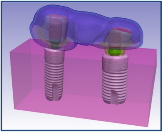 Two implant fixtures along with corresponding customized abutments and FPD were scanned using a micro-CT scanner with a 10 MP camera (Skyscan 1172, Microphotonics Inc.; Aartselaar, Belgium). The scanning parameters used were as follows: an accelerating voltage of 100 KV, current of 100 μA, exposure time of 1264 ms per frame, Al + Cu filter, and rotation step at 0.7°. The x-ray beam was projected in a direction parallel to the long axis of FPD as well as the implant fixtures with secured corresponding abutments. The image pixel size was 34.4 µm. The x-ray projections were reconstructed to form a 3D model, which was saved as a stack of BMP-type 3D files using NRecon software (Skyscan, Microphotonics Inc.; Aartselaar, Belgium). A beam hardening correction of 49% and ring artifact correction of 4 was used for the reconstruction. Cement layers and bone were created in Simpleware software (Synopsys Simpleware ScanIP Version P-2019.09; Mountain View, CA, USA) using segmentation tools.