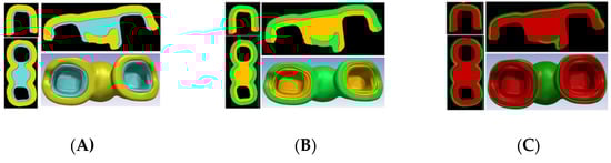 Masks with framework and veneer layers of 1 mm each were obtained using thresholding based on image value, Boolean operations, morphological close, and recursive Gaussian filter tools. Similarly, masks of 0.5 mm and 1.5 mm framework layers, and 0.5 mm and 1.5 mm veneer layers were obtained using Boolean operations. Cement layers were obtained by executing morphological dilate and Boolean operations on abutments. 3D objects were generated for all the created masks, and they were further converted into individual STL files.