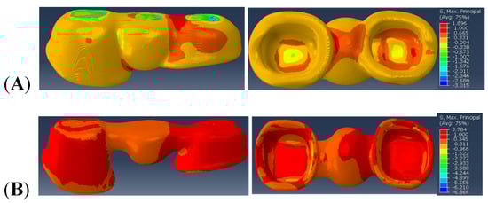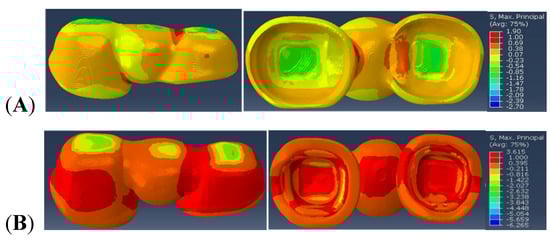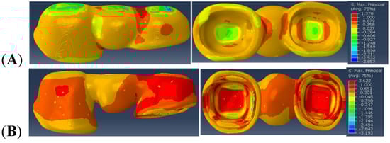 Similarly, the maximal principal stress value observed within Model B is 1.378 MPa in the distal connector region of the veneer. In the framework region of Model B, the maximum principal stress of 3.622 MPa is observed in the distal connector region and intaglio (cementation) surface of the retainers.