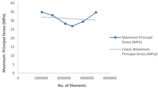 The mesh quality, as determined by the number of elements, was controlled by adjusting the triangle edge length and the ratio between the height and base of the triangles. Using an iterative method, we increased the number of elements along each side and solved. We recorded the complexity of the model (no. of elements) vs. response (observed maximum principal stress value). The obtained maximum principal stress value calculated by varying the number of elements along each edge was plotted graphically. The solution point, wherein the response of the system converges to a solution and further mesh refinement (the addition of more elements) yields no significant response, was considered as the appropriate mesh density for carrying out FEA analysis.