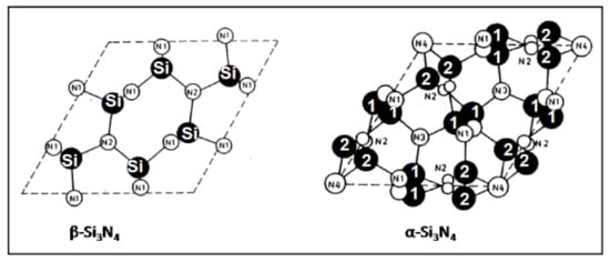 As shown in Figure 1, the structures of hexagonal silicon nitride consist of somewhat distorted SiN4 tetrahedra that, by sharing corners, form distorted hexagonal rings arranged in layers with ABCD … stacking sequence (α-Si3N4) and ABAB … stacking sequence (β-Si3N4).